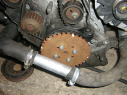 This is my original timing wheel, to get it all aligned I drilled out the pilot hole to 14mm (the same diameter as the Peugeot crank bolt). Then fitted a steel bar across the sump and mounted a the Crank Sensor on some angle iron. Worked well enough but not the prettiest install.